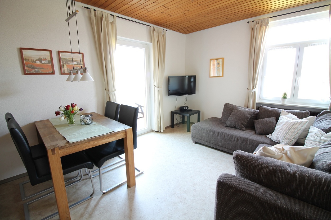1 Schlafraum, großer Wohn-Essbereich, ausziehbares Schlafsofa für mögliche 3. Person, externer Eingang im Keller