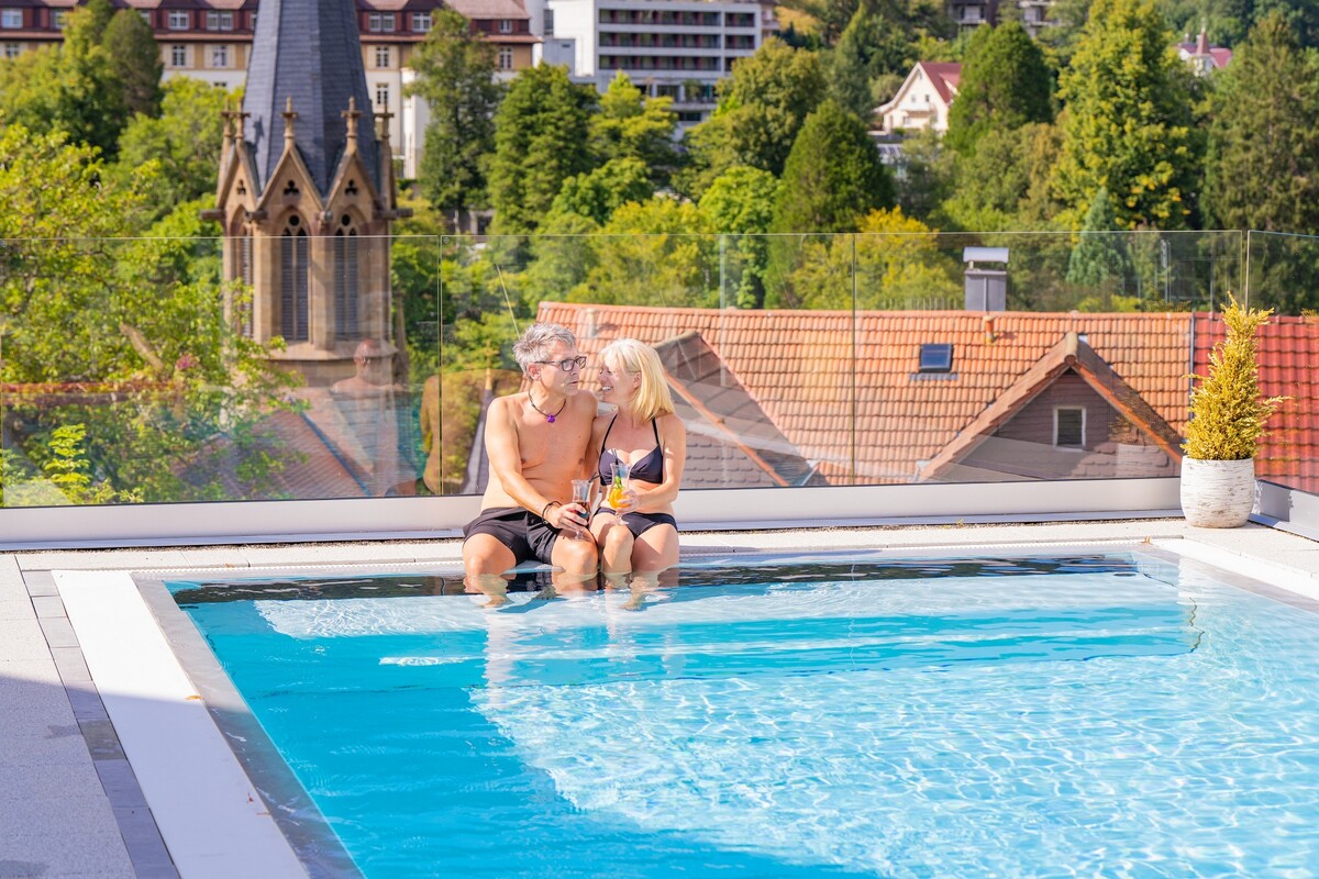 Ein besonderes Highlight von Mai bis Oktober ist unser Infinity Außenpool (10m x 5m) mit einmaliger Sicht auf Bad Wildbad.