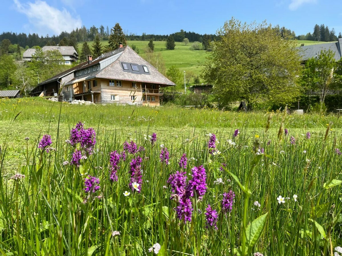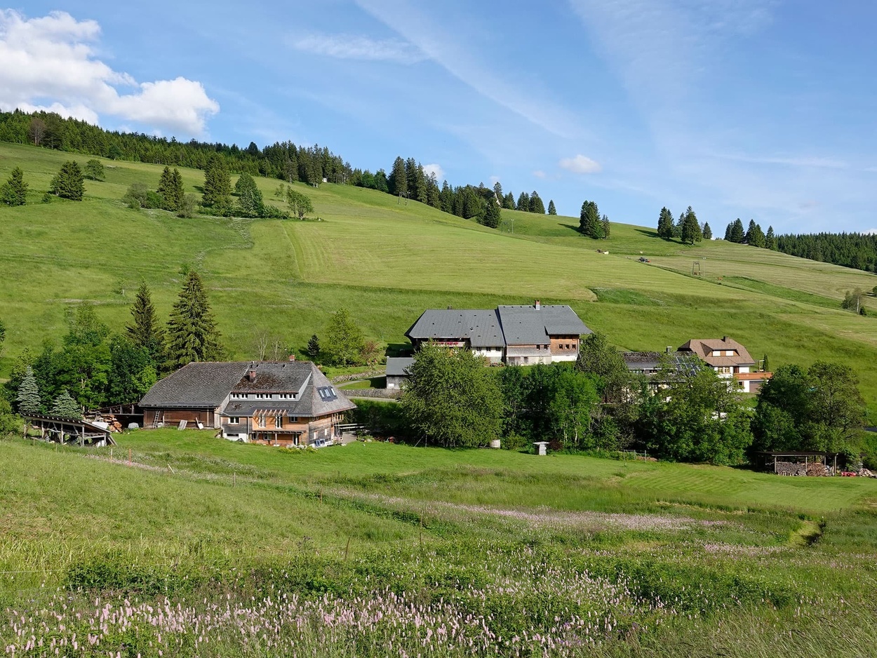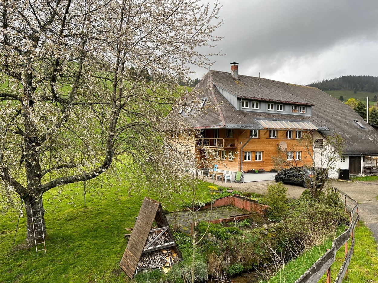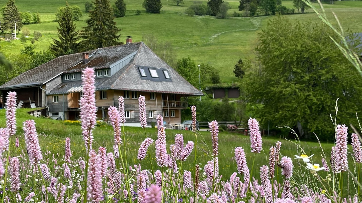 Ab auf den Berg! Naturnahe Unterkunft für Urlaub, Auszeit, Freizeit im sonnigen Hochtal im Südschwarzwald. Freistehend, in ruhiger Lage, auf 1.020 m Höhe mit Weitblick und viel Platz direkt am Bach.zur Unterkunft